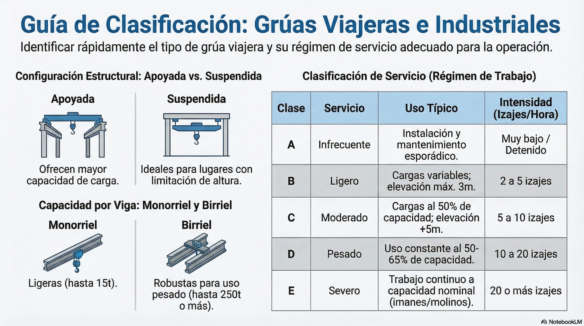 Uno de los errores más comunes en la industria es seleccionar una grúa únicamente por su capacidad de carga. En realidad, lo que determina su desempeño y vida útil es la clasificación de servicio.